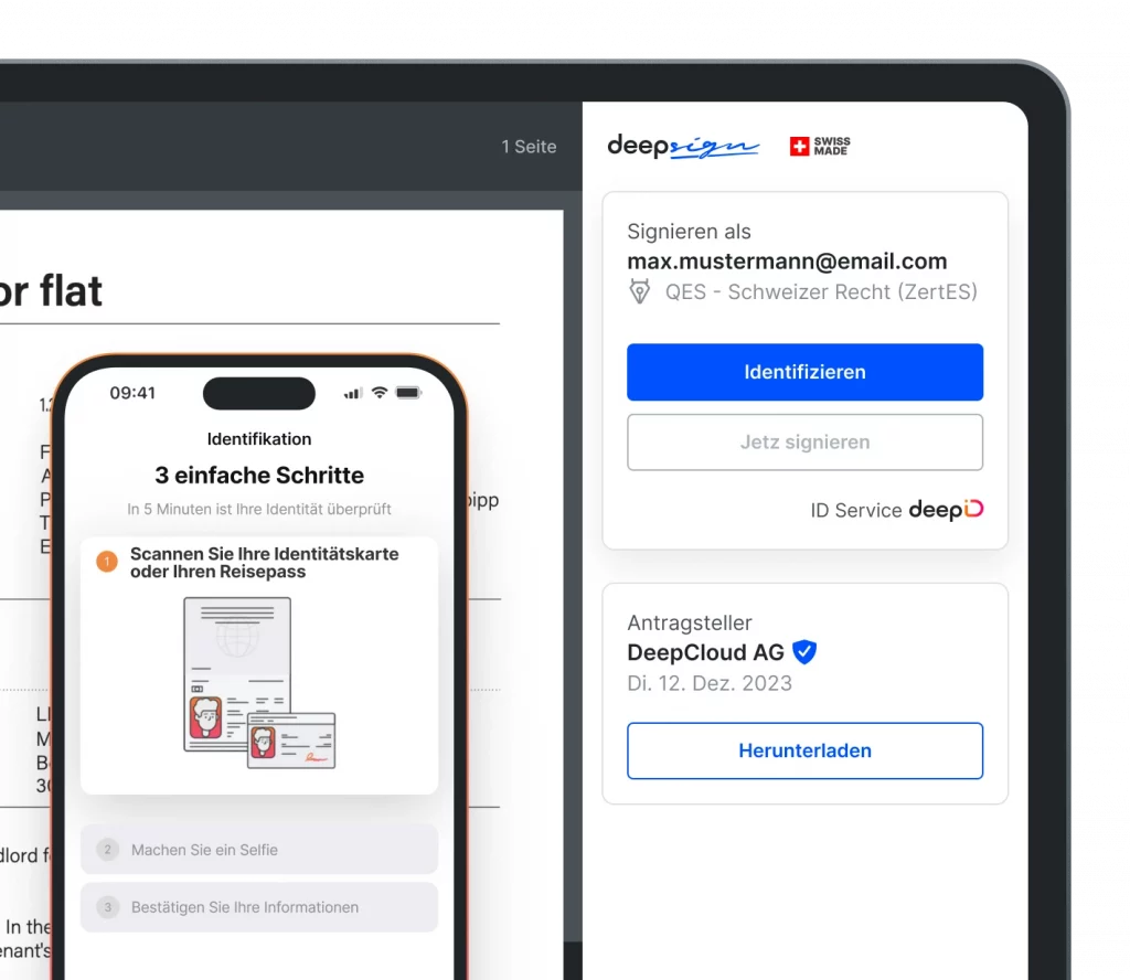 Zur Vertragsunterzeichnung mit einer qualifizierten elektronischen Signatur (QES), die rechtlich der handschriftlichen Signatur entspricht, muss die Identität eines jeden Unterzeichners verifiziert werden. Mit der App DeepSign können Sie und Ihre Mitunterzeichner sich anhand der Identitäts-Applikation DeepID kostenlos auf Distanz identifizieren. Ein weiterer Vorteil: Sie müssen nicht auf Applikationen irgendwelcher Drittanbieter zurückgreifen.