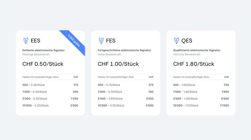 Mit Zertifikat und Zeitstempel. Erfordert Unterzeichner-Identifikation und weitere Authentisierungsmittel. Ist der eigenhändigen Unterschrift gleichgestellt und entspricht der gesetzlichen Schriftform nach Schweizer und EU-Recht.