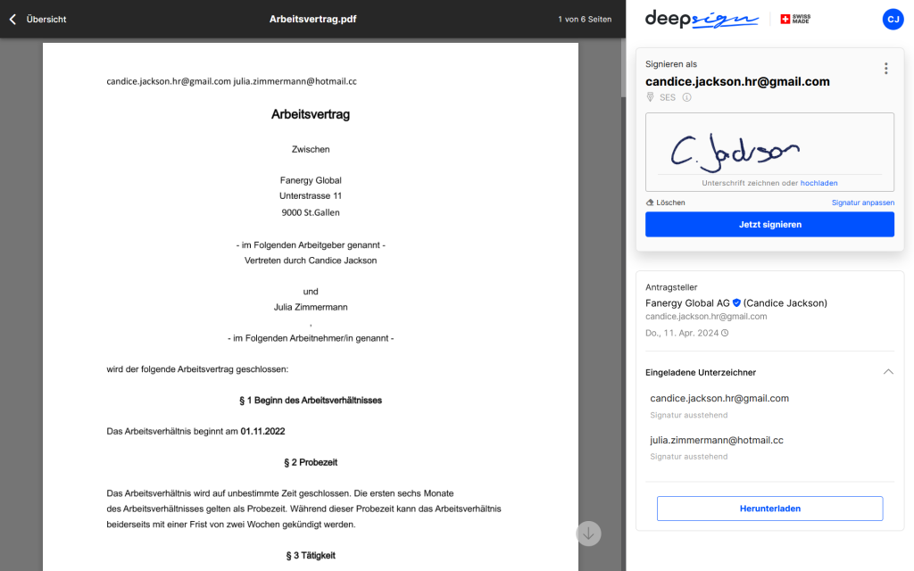 Die Möglichkeit, Verträge auch aus der Ferne zu unterzeichnen, ist in der heutigen Businesswelt unverzichtbar. Mit DeepSign Digitale Signatur lassen sich Dokumente vom PC, vom Tablet sowie von unterwegs auf dem Smartphone mit wenigen Klicks digital unterzeichnen. Gestalten auch Sie Ihre Unterzeichnungsprozedur mithilfe einer flexiblen und effizienten Lösung neu. Und schliessen Sie Vereinbarungen und Verträge deutlich schneller ab.