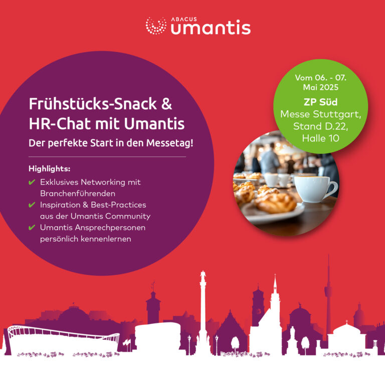 Breakfast snack & HR chat at the Umantis stand We cordially invite you to enjoy and network. Make valuable contacts and benefit from fresh impulses for your HR strategy - directly at ZP Süd! When? May 06 and 07, 2025 from 9 to 11 a.m.Where? Messe Stuttgart, Stand D.22, Hall 10 Are you taking part in our breakfast? YesNo On which day do you take part in our breakfast? May 06May 07On both days Salutation* – Please select –Mr.Mrs.Div Forename* Surname* E-mail address* Enterprise* ZIP CODE* For information on how we process your data, please refer to our Privacy Policy. * Thank you very much! Your download is available here. Download now
