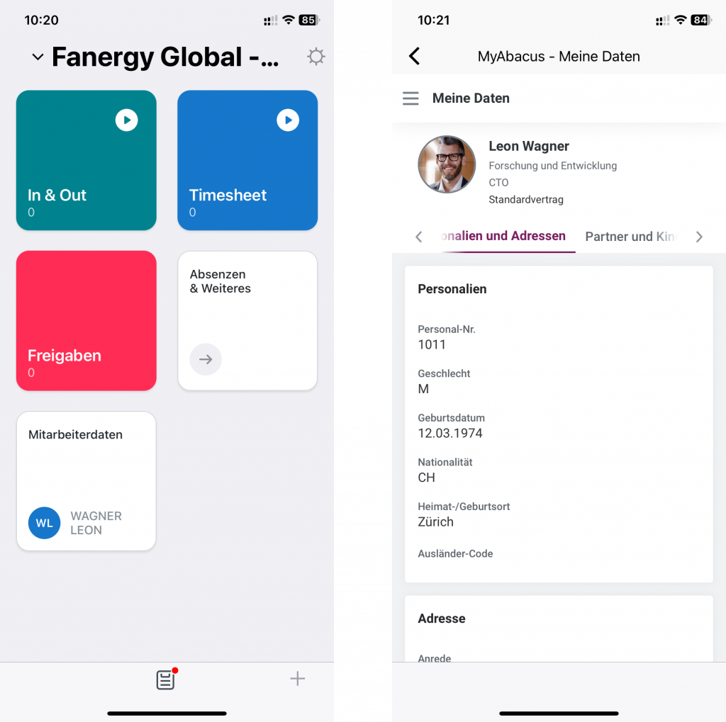 Optimize your HR processes with direct and location-independent access to personnel data. With the AbaClik smartphone app, all employees can view their data at any time and adjust it if necessary. The app also makes everyday work easier with integrated voice control and an AI-supported chatbot - in every conceivable language, even Swiss German.