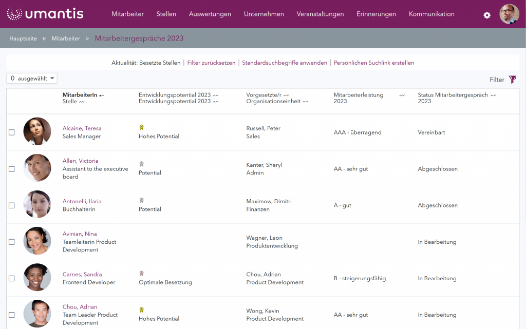 The Umantis software for Succession Planning provides optimum support for this process. Managers can not only use the tool to assess potential. The risk of the employee leaving the company can also be easily assessed. This is particularly important for key positions.