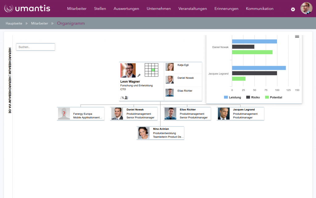 With the Umantis software Succession Planning , you can easily create real-time organizational charts. This allows you to display all positions of employees in the company. You are free to import existing organizational charts or create a new one directly in the tool. For key positions, you can also display a potential-performance matrix of the current job holder and the career plan for the planned successor. This allows you to quickly identify potential weaknesses and act proactively.