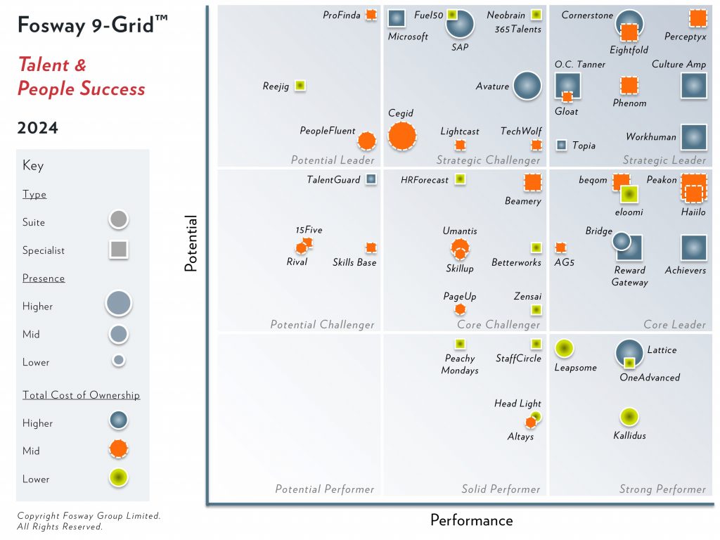 Das Fosway 9-GridTM ist ein fünfdimensionales Modell, das genutzt werden kann, um die relevante Positionierung verschiedener Lösungen und Anbieter in einem bestimmten Marktsegment zu verstehen. Es erlaubt dadurch diese Lösungen marktweit aufgrund verschiedener Bewertungskriterien wie Performance, Potenzial, Marktpräsenz, Gesamtbetriebskosten (TCO) und der zur erwartenden zukünftigen Entwicklung zu vergleichen.