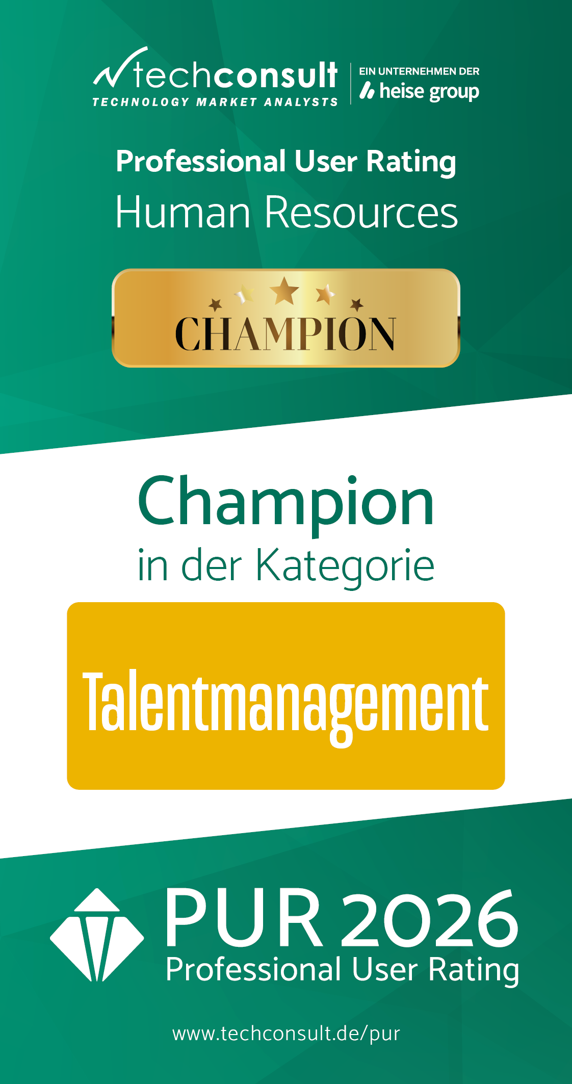 Zusätzlich zur Auszeichnung im Bereich Self-Services ESS/MSS wurde unser Unternehmen von techconsult, einer angesehenen Analyseeinheit der Heise Groupe, auch als Champion im Bereich Talentmanagement anerkannt. Diese doppelte Auszeichnung unterstreicht unsere Innovationskraft und unser Engagement für moderne, wirkungsvolle Lösungen, die Unternehmen in ihrer strategischen Personalentwicklung unterstützen.