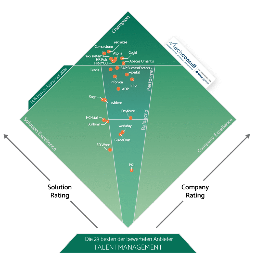 Die „Champion“-Auszeichnung von techconsult ist ein Beweis dafür, dass unsere Talentmanagement-Lösungen in der Praxis hohe Anerkennung finden und den Ansprüchen der heutigen Arbeitswelt gerecht werden. Diese Bewertung zeigt, dass unsere Lösungen: