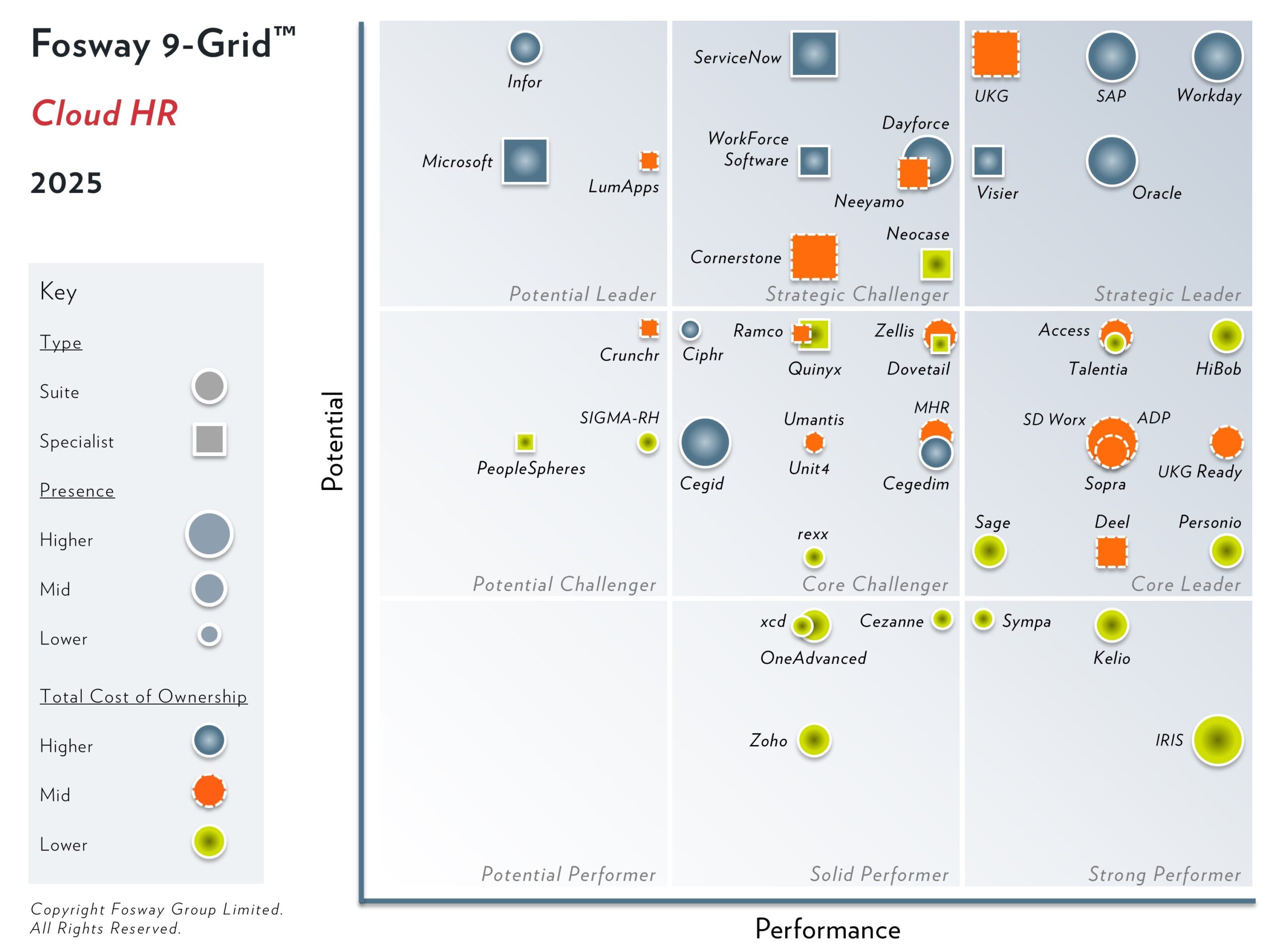 Das Fosway 9-Grid™ vergleicht Anbieter im EMEA-Markt entlang Performance, Potenzial, Marktpräsenz, Gesamtbetriebskosten (TCO) und Trajectory – und liefert Unternehmen eine kompakte, unabhängige Orientierung bei der Auswahl von Cloud-HR-Lösungen. Eine Einstufung als Core Challenger signalisiert breite Abdeckung, starken Fit und Time-to-Value bei attraktiver TCO.