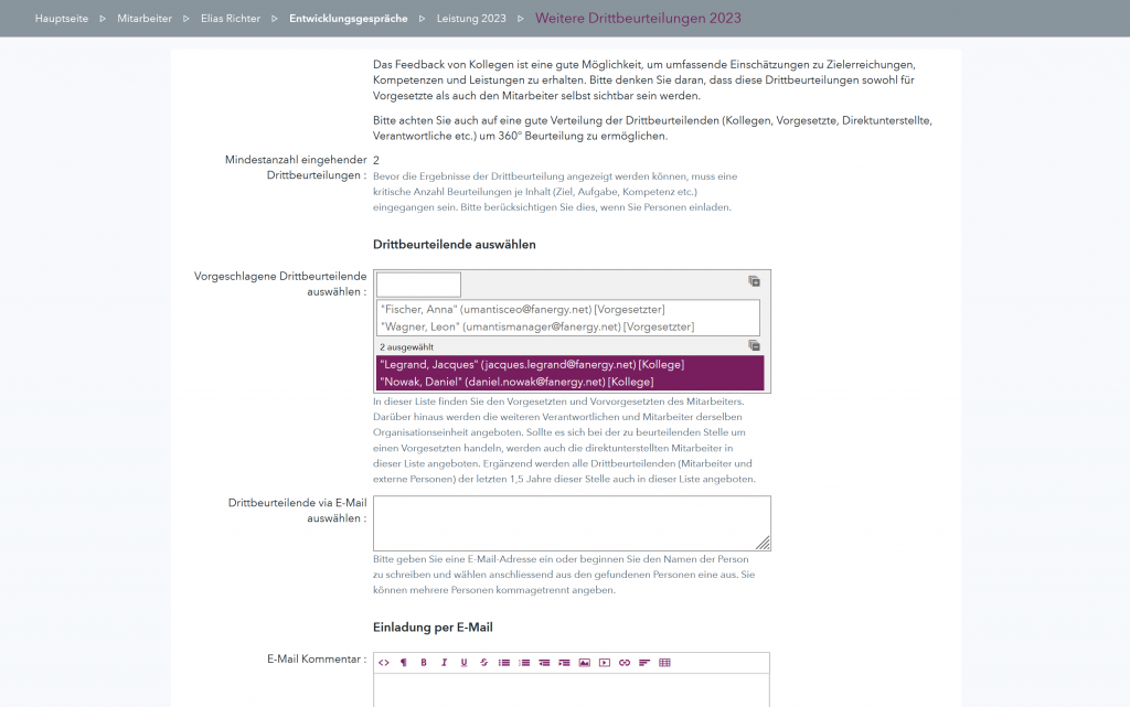 Um eine vollständige Beurteilung (360°-Feedback) Ihrer Mitarbeitenden zu erhalten, sind die Bewertung und das Feedback Dritter oft wertvoller als das der Linienvorgesetzten selbst. Kolleginnen und Kollegen, Projektmitglieder oder Projektleitende können die Arbeit oft besser einschätzen. Gab es doch zuvor eine direkte Zusammenarbeit innerhalb bereichs- und unternehmensübergreifender Projekte.
